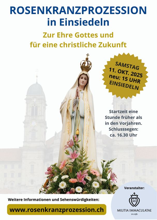 Am Samstagnachmittag, 12. Oktober 2024, fand in Einsiedeln eine grosse Rosenkranzprozession mit Fahnen, Blasmusik, Gesang und Gebet statt. Rund 730 Personen, darunter viele Jugendliche und Familien, nahmen an der Prozession teil. Rückblick mit weiteren Fotos: